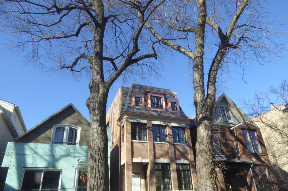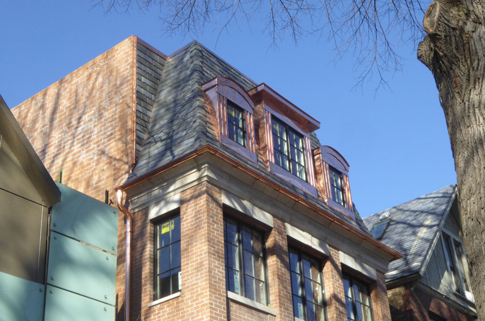 Project Date: January 2017 Location: 2624 N. Burling St., Chicago Category: Ornamental Work We supplied and installed composite synthetic slate tiles, 16 oz copper over the three dormers and standing seam 16 oz copper panels over the dormers. Previous Project Next Project