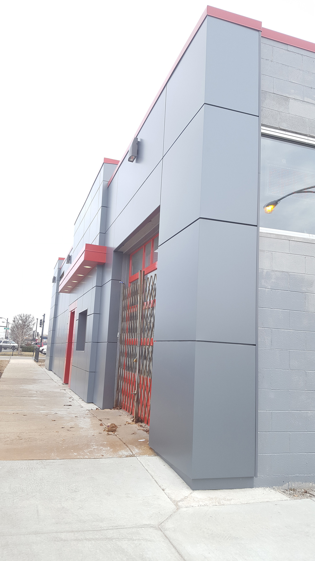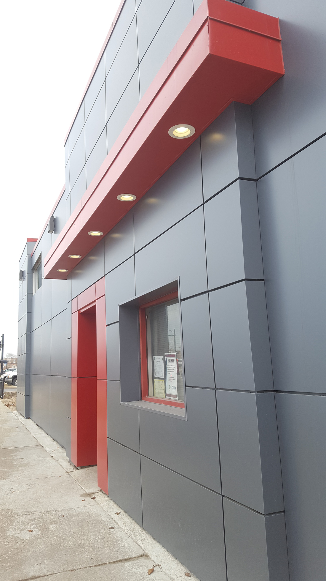 We re-shaped the front elevation with metal framing and clad it with composite petal panels (dry system) in two colors, to achieve the look designed by the architect. All necessary flashings and coping was provided to keep the installation water tight.